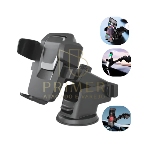 O suporte conta com uma ventosa de silicone, que garante uma fixação segura e estável, mesmo em superfícies irregulares ou em movimento. Além disso, possui uma trava automática que mantém o celular firmemente no lugar, evitando quedas ou deslizamentos.