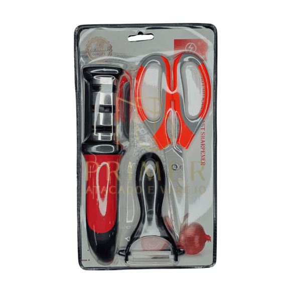 Kit indispensável para a sua cozinha! Conta com um amolador de facas com três fases de afiação:
